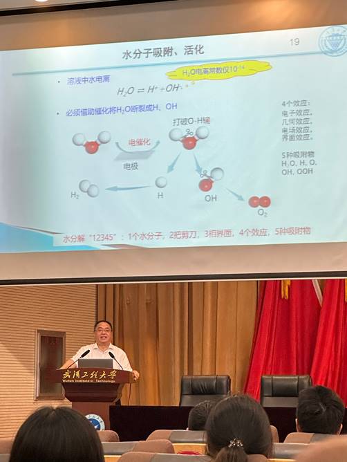 报告会上,魏子栋教授介绍了我国提出在2060年前实现碳中和的目标,构建低碳清洁且高效安全的能源体系以实现可持续发展的战略决心。魏教授重点介绍了其研究团队在电解水制氢领域取得的一系列重大突破,对该领域的研究重点及面临的难题做了深入细致的剖析。随后,魏子栋教授与师生一同探讨了电解水制氢的反应机理,催化析氢的“烟囱效应”,以及电解槽的系统设计。报告结束后,在场师生与魏子栋教授进行了深入交流和热烈讨论,并对魏教授的精彩分享表示感谢。