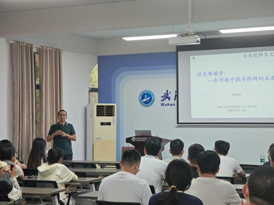 郭志光教授以《仿生荷叶性能的超润湿表面,生命自修复性、原子级别的上的摩擦机理,仿生摩擦学研究的最前沿研究》为题,提出了当今世界和中国仿生摩擦学存在的机遇及挑战,分析了表面张力与材料所呈现性能的对应关系,让师生们对仿生摩擦学的研究有了全新的认识和理解。