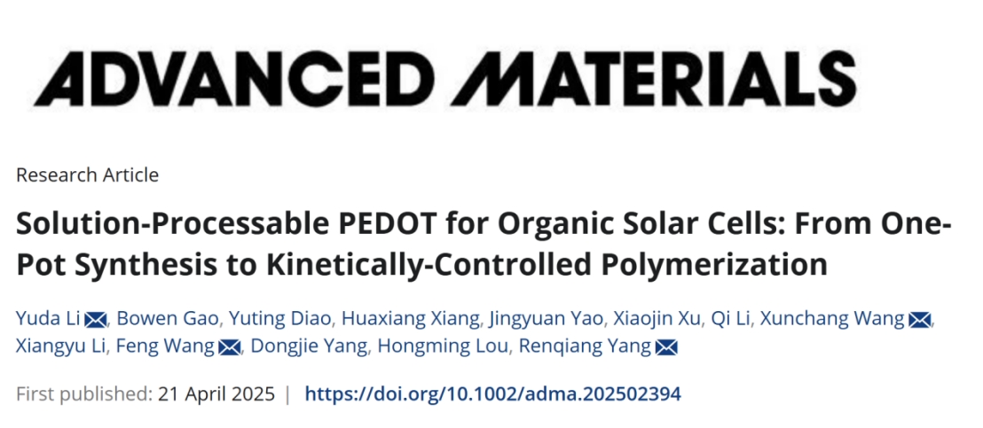 本网讯(通讯员 李昱达)近日,足彩比分 高分子精细化工绿色新材料创新团队在材料科学领域国际顶级期刊Advanced Materials影响因子27.3,中科院大类1区期刊,武汉工程大学Top期刊上发表了题为“Solution-Processable PEDOT for Organic Solar Cells: From One-Pot Synthesis to Kinetically-Controlled Polymerization”研究论文。武汉工程大学为第一署名单位,足彩比分 李昱达副教授和汪锋教授为共同通讯作者,江汉大学为合作研究单位。