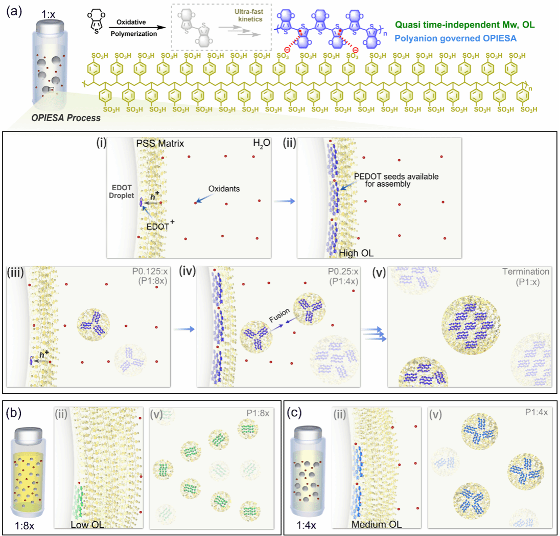 该研究工作的亮点在于阐明了导电聚合物的氧化聚合诱导静电自组装(OPIESA)机制,提出了导电聚合物的动力学可控聚合(KCP)新方法,突破Bayer/Heraeus专利一锅法(OPS)的局限性,将生产时间效率提升100倍以上,解决导电聚合物悬浮稳定性与导电性难以兼具的难题,助力有机光伏电池效率突破20%。该工作对于重构导电聚合物乳液的国际市场供应格局具有重要促进作用,并为精细化工乳液产品的高值化应用提供了新的见解和思路。