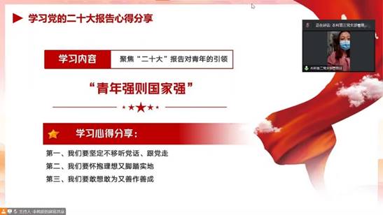 在学习党的二十大报告分享环节,本科化工第三党支部发展对象曹思贝同学首先以《青年强则国家强》为题分享心得。她表示青年一代应牢记总书记嘱托,在全面建设社会主义现代化国家的新征程上奉献不可或缺的青春力量,她号召大家要坚定不移听党话、跟党走,对如今的同学们而言,最重要的应当是抓住时光,打好知识基础,学好专业知识,练真本领,学有所用,学以致用,提高自己的工作水平和实践能力,为今后服务国家和人民贡献自己的力量打好基础。要怀抱理想又脚踏实地,青年党员要永葆初心,有着“积土成山,风雨兴焉;积水成渊,蛟龙生焉!”的意识,有着“不积硅步,无以至千里;不积小流,无以成江海”的决心,怀抱理想,脚踏实地,为实现中华民族伟大复兴奋斗终身。要敢想敢为又善作善成,既要善于干事情更要善于把事情办好,做到三放三勤——放下娇气勤于动手、放下畏惧勤于询问、放下“过去”勤于开始,成为有理想、有本领、有担当的青年一代。