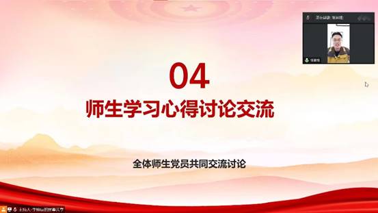 在师生心得交流环节,化学工程教师党支部张林峰老师在听完三位同学的学习分享后表示深受启发,他提出三点希望,一是希望以后能多举行师生联合主题党日,丰富主题党日活动形式拉近师生距离;二是希望在未来的联合主题党日活动中能够同时为在学业、科研、学科竞赛等专业领域有困惑的同学们答疑解惑,增进导学关系;三是针对近日学校严峻的疫情形式,希望党员同志们都能具有党员的自觉,担当起了党员的模范带头作用,在转为线上教学后,各位老师们也始终尽职尽责的在进行教学,希望同学们在本学期最后一个月抓紧时间,克服困难,努力学习,也希望考研的各位同学更要抓住冲刺阶段宝贵的时间,考出理想的成绩!