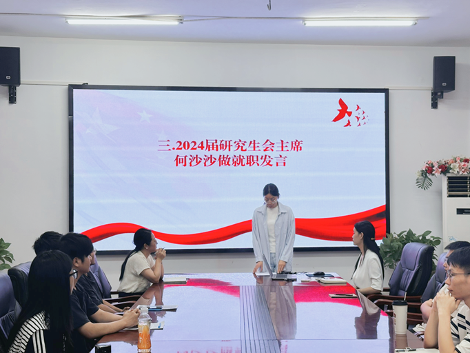 会上,上一届研究生会主席闫朋朋就上届研究生会工作进行总结并进行个人述职报告。闫朋朋就研究生会各部门职责和举办的活动向2024级研究生班委做了介绍。各部门充分发挥了研学会的桥梁作用,协助学校和学院举办了如辩论赛、运动会等丰富多彩的活动,让同学们在科研实验之余,劳逸结合。上一届研学会高质量完成学生工作给新一届研学会树立了榜样。随后,闫朋朋宣布2024届研究生会任职名单。