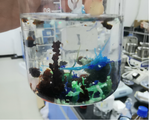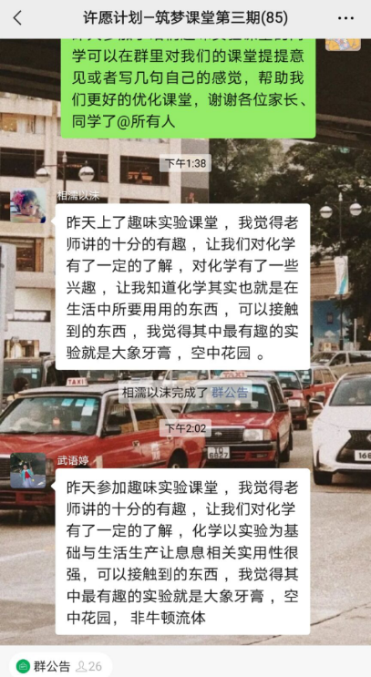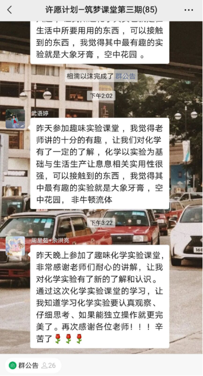 一个个实验如魔术般轮番上阵,不断地吸引着孩子们的眼球,引起大家阵阵惊讶声,并纷纷提问“为什么那个泡沫变颜色了”“时间越长,水中花园会不会一直长大”等等,纷纷探求着其中的奥妙,志愿者们针对提出的问题一一做出解答。课堂结束时,小同学们意犹未尽,强烈地表达出了对化学实验课的兴趣,并且期盼下一节趣味课堂的到来。