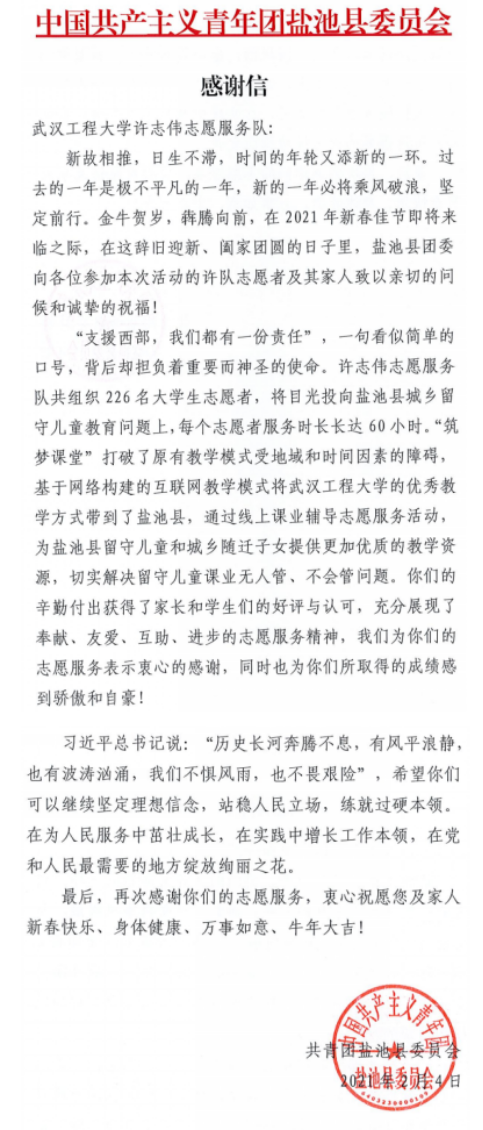 本网讯(通讯员 沈霁月)“一句看似简单的口号,背后却担负着重要而神圣的使命。正因有了226名志愿者的付出,才切实解决了盐池留守儿童和城乡随迁子女课业无人管、不会管的问题……”,2月6日,足彩比分 - 精准及时的足球竞彩比分 收到了一封来自宁夏盐池县团委的感谢信,信中感谢的是学院许志伟志愿服务队。