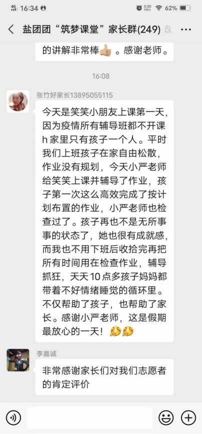 “我由衷地希望我们两个的遇见会成为彼此的幸运,也非常希望活动结束后,小朋友会记得曾经有一个大一的小老师从他的世界路过”,六十个小时线上课程结束后,来自20级工商管理班的志愿者张晓芳在空间写下这样的感言,“其实我本来已经做好可能遇到家长和小朋友不积极配合的准备,但实际上家长和小朋友都特别友好特别配合,这也给了我更大的信心和动力去帮助小朋友更好地成长”。