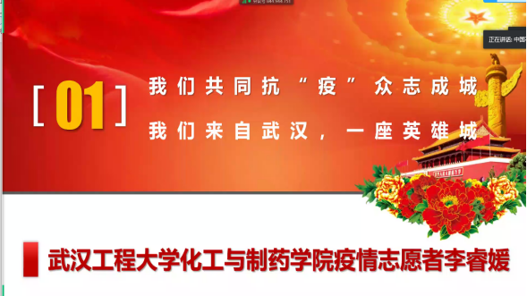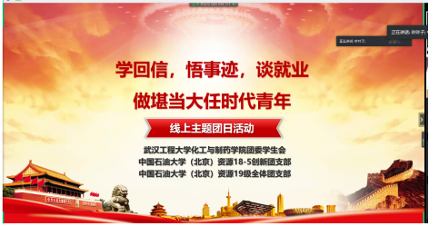 武汉工程大学校团委书记刘念表示,本次两校线上分享主题团日活动非常成功,是两校进一步加强交流合作,进行“一帮一”的良好开端,非常感谢中国石油大学(北京)为学校传经送宝。希望疫情过后,两校也能够继续共同开展活动,将类似的互动常态化,让两校友谊之花常开。他指出,在此次抗击疫情的过程中许多青年义无反顾地投入到抗疫的战线中,充分展现了青年一代不畏艰险、冲锋在前、爱国奋斗、自强不息的精神风貌,“新时代的中国青年是好样的,是堪当大任的”。他对同学们提出三点希望,一是要做到爱国力行,同学们要用自己的方式投身到这场全民“战役”中。二是要勇挑重担,要争做一名接的好班、扛的起重任的新时代青年。三是要制度自信,能够敬畏生命崇尚科学,练就过硬本领,快速成长起来。他相信,青年一代是有理想有担当的一代,只要大家奋发图强、克难攻坚,国家就有前途,民族就有希望。只要坚定奋斗信念,勇担时代重担,书写爱国篇章,就能将青春之花绚丽绽放。