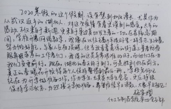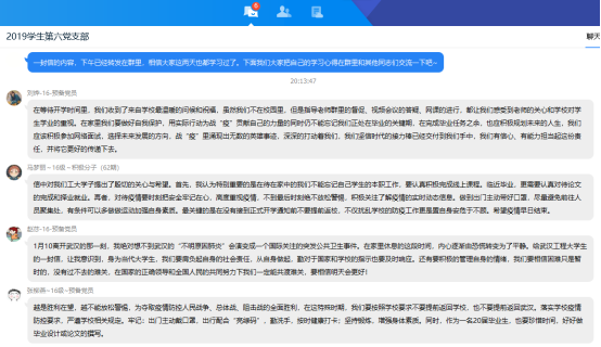 在学校推出一封信后,学生三支部立即组织支部党员通过网络,深入学习相关内容,领会有关精神。支部党员读信后深受鼓舞,展开热烈讨论,并在云端发起给学校写一封回信的活动,党员们踊跃参与,在群里晒回信、晒感想,表达自己对于学校、学院、同学的想念之情,并表示将继续做好防疫工作,在未接到返校通知时,坚持居家隔离、健康打卡、线上学习,积极配合学校的防控决策部署,争做防疫先锋,树好党员这面伟大旗帜。