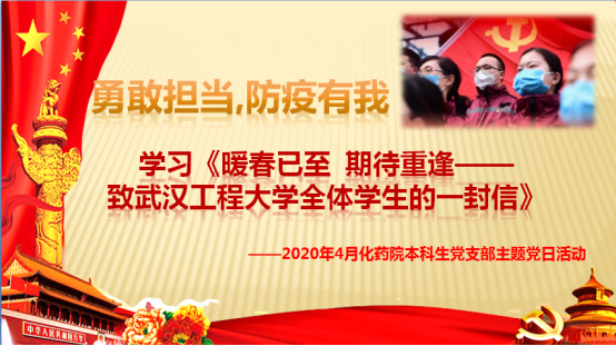 各本科生党支部纷纷行动起来,围绕学校致全体学生的一封信内容,开展了“勇敢担当 防疫有我”主题党日活动,学习防疫指南、致敬抗疫英雄、加强线上学习,增强党员的责任意识。