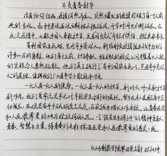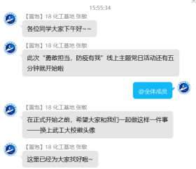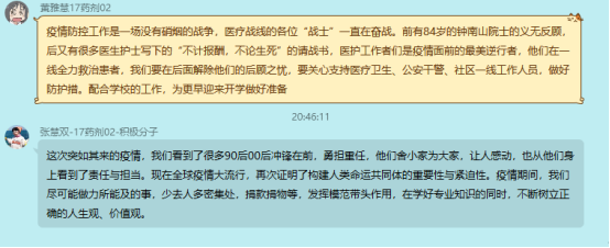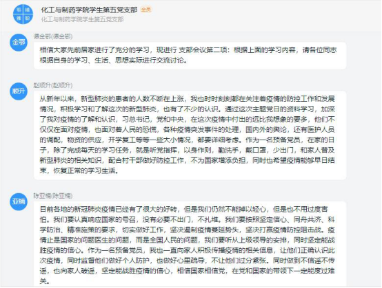 线上会议期间,各支部党员积极开展讨论,凝聚了正能量。学生党员们围绕最美逆行者的先进事例和身边亲友的抗疫事迹,结合化工、制药专业特色以及学生党员身份,谈认识、讲体会、话担当,进一步增强了责任感和使命感。本科五支部的叶令飞同学表示,将充分发挥党员先锋模范作用,自觉遵守相关防控要求,尽己所能为家乡贡献力量;本科六支部的毕业生党员赵莎同学表达了自己的抗疫决心,表示将积极响应学校号召、认真备战考研,自觉恪守学生党员本分,不负青春韶华;本科七支部的张慧双同学表示,疫情期间将尽可能做力所能及的事情,在学好专业知识的同时,不断树立正确的人生观、价值观。