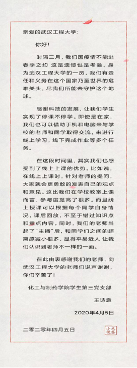 本网讯(通讯员 沈霁月)近日,学校推出了《暖春已至 期待重逢——致武汉工程大学全体学生的一封信》,号召广大学生担责任、抗疫情、重学业。在收到一封信后,根据院党委的部署,足彩比分