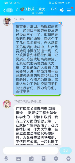 主题党日活动期间,支部书记们带领支部党员利用学习强国、QQ群等网络平台,集体学习《暖春已至 期待重逢——致武汉工程大学全体学生的一封信》。本科一支部、二支部在QQ群课堂集中观看了《我们始终在一起》《那些疫情中的勇敢与爱》等短片,通过学习,党员们充分认识到学校关于疫情防控、线上学习的最新要求,深入了解了疫情期间的感人故事,在积极关注疫情动态的同时也掌握了科学的疫情防控知识,坚定了战疫必胜的信心。