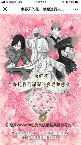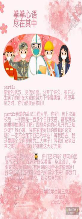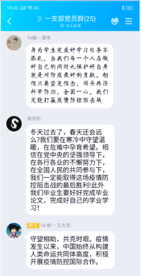 “珍惜当下,体味生命的温度;努力上进,增加生命的厚度”“愿山河无恙,致敬抗疫一线的英雄”,学生四支部19位学生党员借助笔和纸,用最常见却最温情的方式道出心声,表达青年学子身体力行、防疫有我的必胜决心,用朴实的语言表明自己居家防疫、做好线上学习的坚定态度。学生一支部、二支部在支部书记的号召下,通过QQ群,开展了“我为抗疫英雄献花”的云献花活动,支部党员全员参与,在云端寄托学生党员对抗疫英雄们的哀思和感激之情。