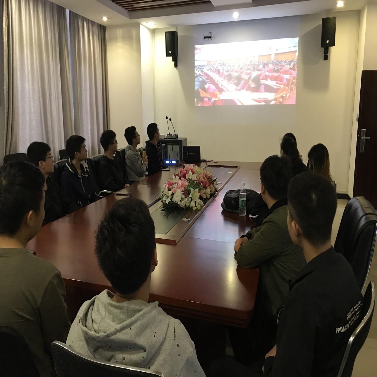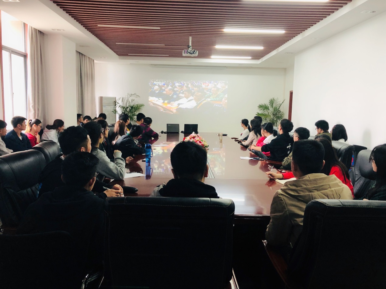 师生在会议室集中观看纪念五四运动100周年大会直播,院党委书记王雪梅、副书记田勇、副院长刘生鹏、教学办学工办的老师以及青年学生代表参加了本次活动。