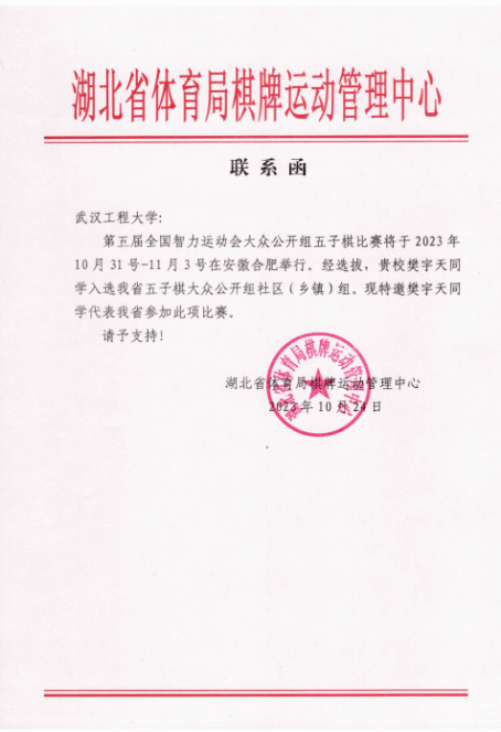 2023年是武汉工程大学五子棋校队建队十周年,这一年也是樊宇天进步最为迅速的一年,六月参加了省大学生精英赛,七月被选拔进入湖北队,八月和省队队友参加浙江丽水举办的全国智力运动会预赛并成功晋级,九月在山东济南又一次捧起全国大学生比赛的冠军奖杯,十月前往安徽合肥参加四年一度的全国智力运动会五子棋项目大众公开组,也是如今中国五子棋项目的最高竞技舞台,收获了很多宝贵的经验。他说到:“这一切要感谢校队创始人王道蓬学长,感谢我的队友史宇轩、刘宇君、王春谱以及每一位校队成员,同时也离不开湖北省体育局、校体育部和校队教练员乐建军老师以及领队范东芳老师的大力支持。2021至2023三年期间,工大五子棋校队实现了全国赛两冠一亚,湖北省赛三连冠的大满贯战绩,希望更多的工大学子加入我们,继续创造属于工大五子棋的辉煌。”