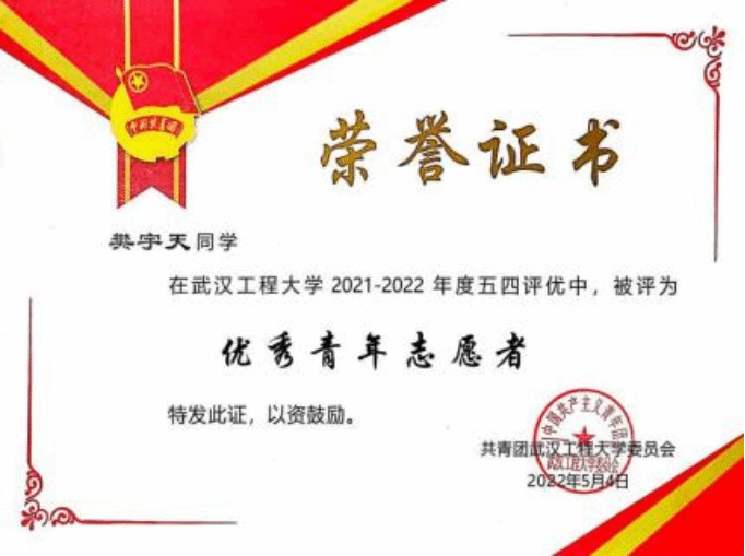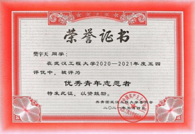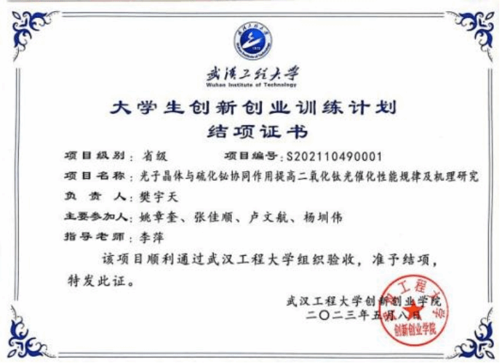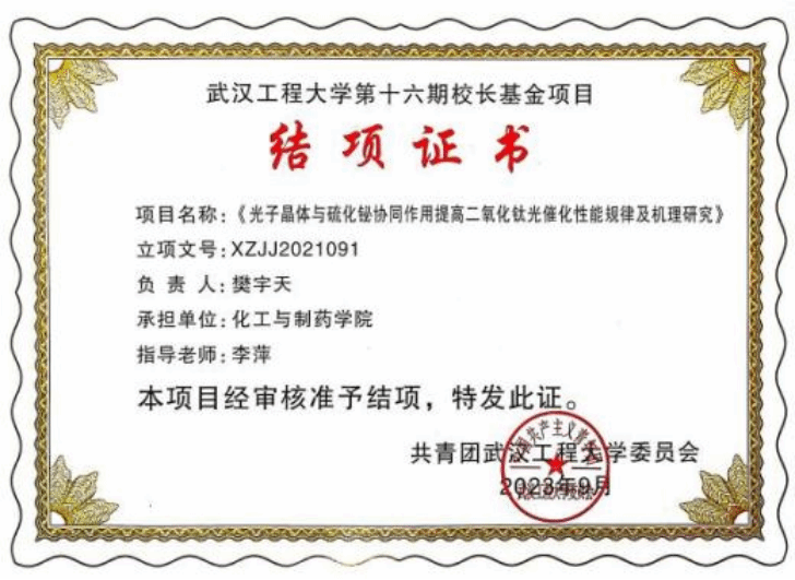 从大一开始,樊宇天申请加入学院李萍老师的实验室进行科研训练,主持了湖北省大学生创新创业项目1项和武汉工程大学校长基金项目1项,目前均已结项;发表论文5篇,其中一区SCI期刊论文1篇、二区SCI期刊论文1篇。