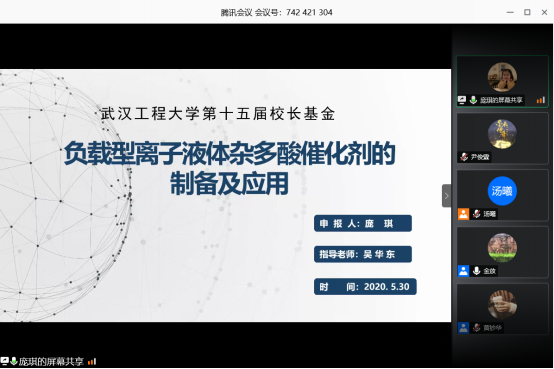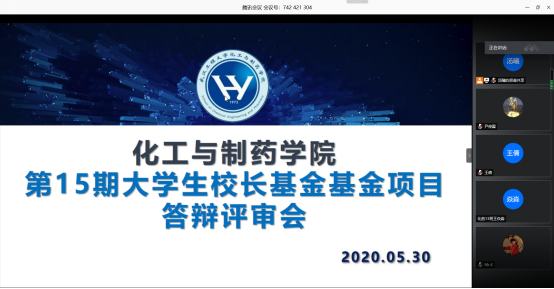 通过腾讯会议举行第十五期校长基金立项答辩云端评审会。副院长龙思会教授、金放教授,院长助理闫志国教授、制药工程中心主任古双喜教授和化工系副主任熊芸副教授担任评审专家并出席会议,会议由院团委书记黄钞华主持,项目组成员及部分18、19级学生参加会议。