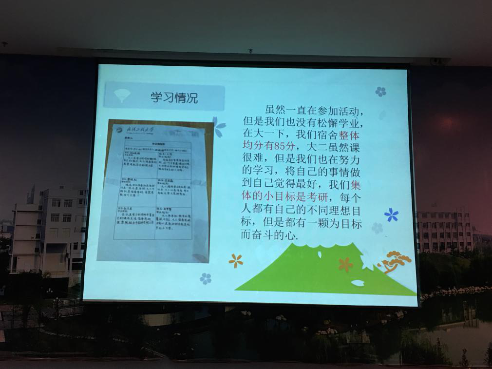 活动开始,参赛寝室按照抽签顺序依次上台进行PPT竞演,随后,入围的宿舍精心编排了舞蹈、歌曲串烧、朗诵、原创小品、童话舞台剧等,参赛同学活力四射,幽默风趣,现场掌声不断。