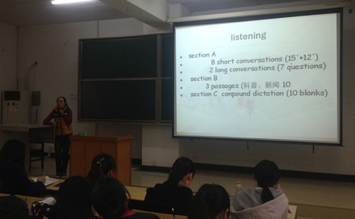外语学院游桂兰老师介绍了考试时间、考试题型和考试分数等考试基本信息。她分别针对写作、听力理解、阅读理解和翻译等四个不同题型,讲授具有针对性的复习方法和答题技巧,并推荐相应的复习文献资料。随后,她分别针对已准备充分的学生和准备不理想的学生给出自己的冲刺复习建议。