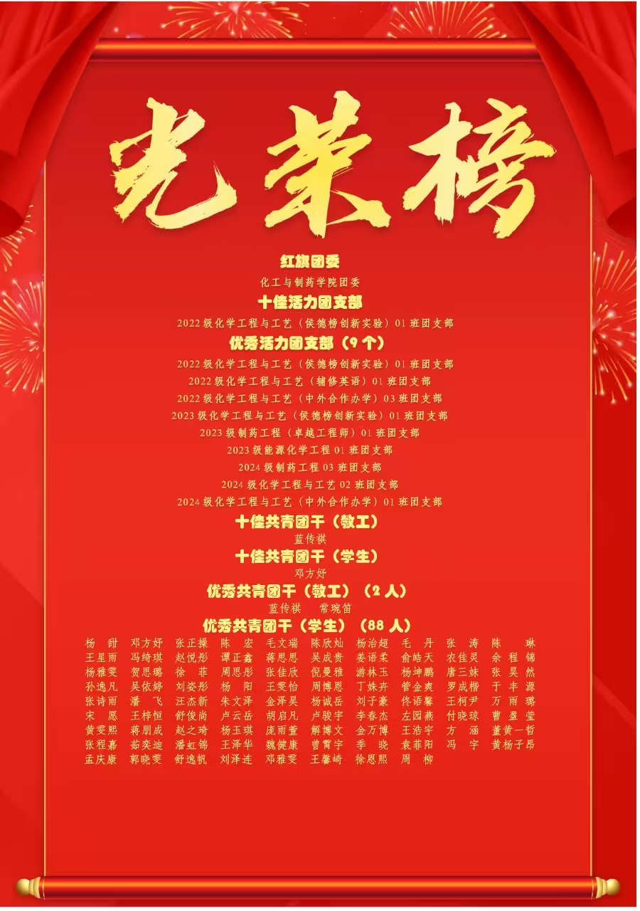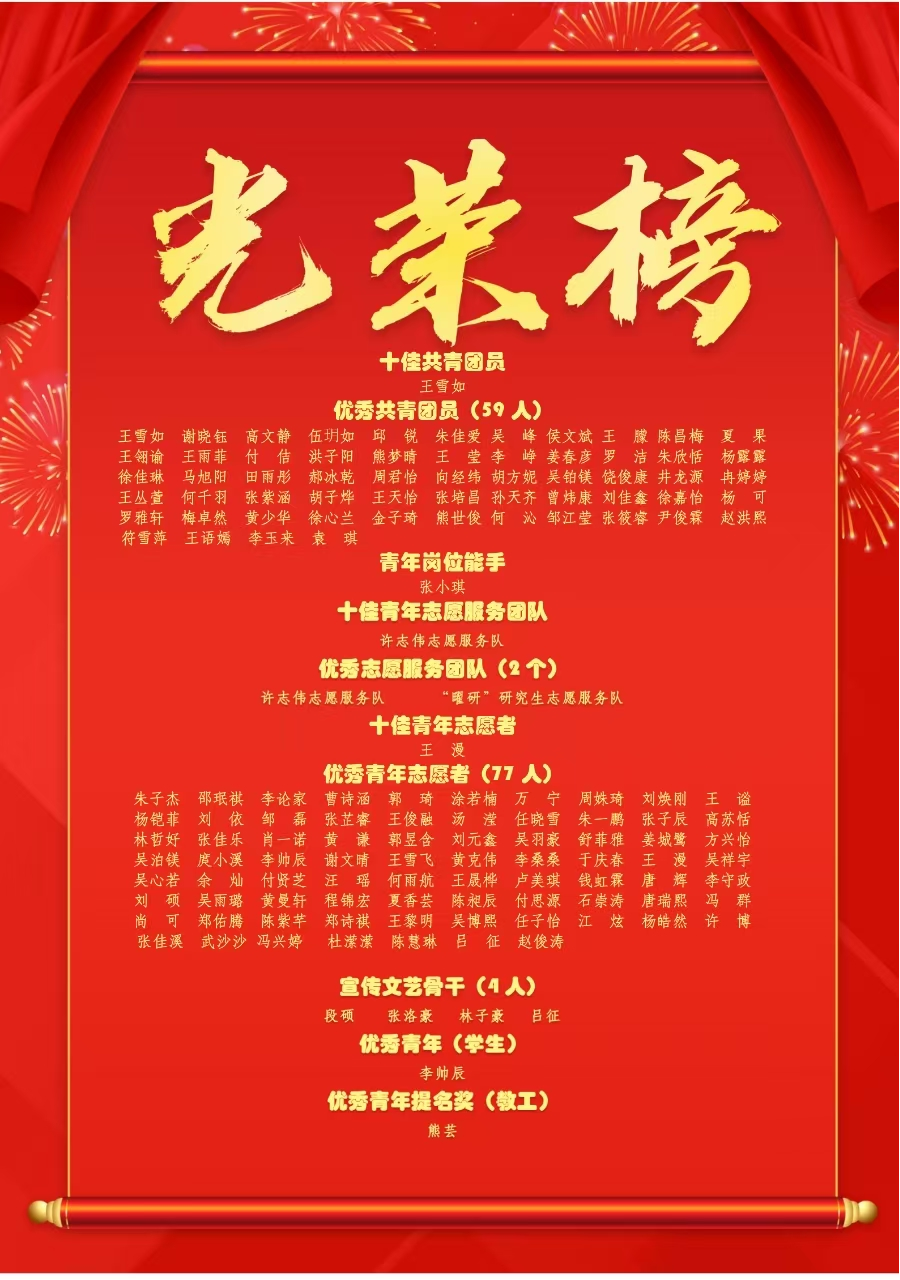 团委获评武汉工程大学“五四红旗团委”。许志伟志愿服务队荣获“十佳青年志愿者服务团队”,2022级化学工程与工艺(侯德榜创新实验)01班团支部荣获“十佳活力团支部”,熊芸教授荣获“优秀青年提名奖(教工)”,蓝传祺荣获“十佳共青团干(教工)”,邓方妤荣获“十佳共青团干(学生)”,李帅辰荣获“优秀青年(学生)”,王雪如荣获“十佳共青团员”,王漫荣获“十佳青年志愿者”。