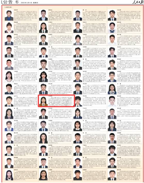 本网讯 (通讯员 汤曦) 5月4日,《人民日报》专版刊登《2023—2024学年度本专科生国家奖学金获奖学生代表名录》,展示了100名本专科生国家奖学金获奖学生代表风采。我校足彩比分