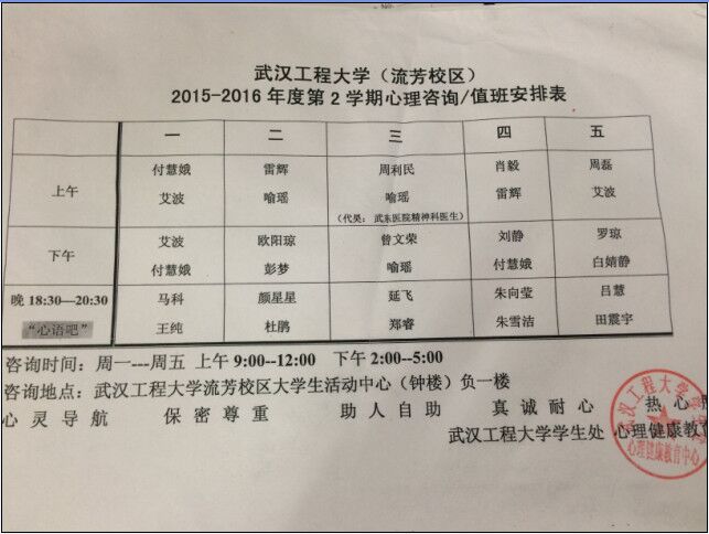 2016年3月,在学生处,校团委和大学生心理咨询中心领导们的支持下开设了“心语吧”专栏,于每周周一到周五晚为同学们提供更多更新颖的咨询和倾诉方式,专为心理压力大,想得到咨询的同学们提供这一较为轻松的以谈话模式为主的缓解压力的平台,排班表如下图,同学们可根据自己的实际情况提前2天预约自己想约谈的老师。