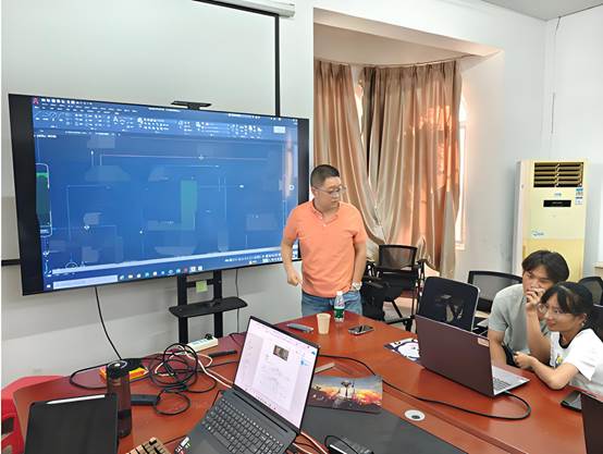 在展示交流环节,李飞阔详细查看各参赛队伍的设计作品,指出图纸中存在的问题和不足,耐心解答了同学们参赛过程中存在的疑问,给出了详细具体的修改意见和解决措施。