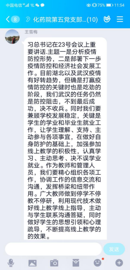 两位支部书记强调党员教师们要坚决贯彻落实党中央和学校、学院党委对疫情防控的部署要求,带头做疫情防控的宣传员、服务员、守门员,同时也提醒支部党员做好工作规划、扎实开展线上教学,坚定必胜信念、勠力同心、抗击疫情。