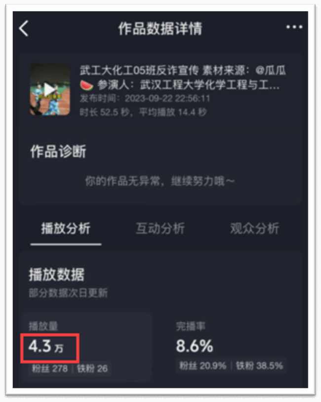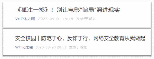 开学以来,学院认真响应湖北省教育厅、湖北省地方金融监督管理局《关于开展防范非法校园贷和电信网络诈骗教育的提示》和武汉工程大学关心下一代委员会《关于开展“大学生国防、安全、心理健康教育” 公益大讲堂活动的通知》的号召,广泛宣传反诈知识和积极动员学生参与创作反诈网络文化作品,发布网络安全、反诈教育相关推文,引导全院学生学习“星空班会——五个电话(2023版)小心炸弹’ —— 校园版孤注一掷’ ”网络小课堂,收到学习截屏540余张,公益大讲堂线上课程累计观看7300余次,组织召开线下主题教育班会40余场,收取以班级为单位的学习心得40余份,激励学生拍摄反诈相关情景剧作品9部,其中,《防诈超重要》反诈宣传视频在抖音播放量达4.3万。