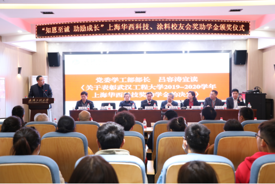 会上,党委学工部部长吕容涛和校友代表王崇武分别宣读《关于表彰武汉工程大学2019-2020学年度上海华西科技奖助学金的决定》和《关于颁发武汉工程大学2020年涂料校友会涂料学科特别贡献奖、学术带头人、优秀教师、优秀学子的决定》,勉励获奖学生应常怀感恩之情,常行报恩之举,崇德向上向善,回报社会、回馈母校。