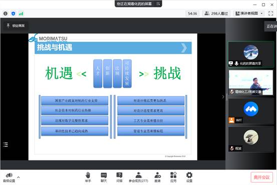 本网讯(通讯员 汤曦)5月5日下午,由学校招生与就业工作处主办,足彩比分 承办的职业经理人行业讲座在流芳校区化工大楼610报告厅和腾讯会议室同步举行。上海森松制药设备工程有限公司武汉分公司总经理黄胜受邀作“化工与制药相关专业如何适应国家智能制造产业升级”的主题报告,学院党委副书记周丹、院长助理刘根炎出席会议,学院教师樊庆春、350余名学生代表参加会议,会议由19级辅导员汤曦主持。