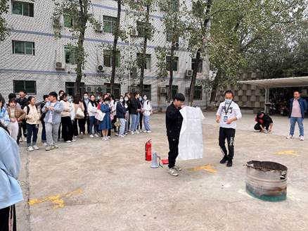王老师详细讲解了干粉灭火器、灭火毯、防毒面具的性能、基本原理等操作方法,现场讲解并演示了各类消防器材的使用要领和注意事项。在细致的讲解之后, 王老师耐心指导同学们进行现场实操,强调了灭火器与灭火毯的操作要领和灭火时的风向判断等。同学们积极参加实操,掌握了基本操作方法,应急演练达到了预期效果。