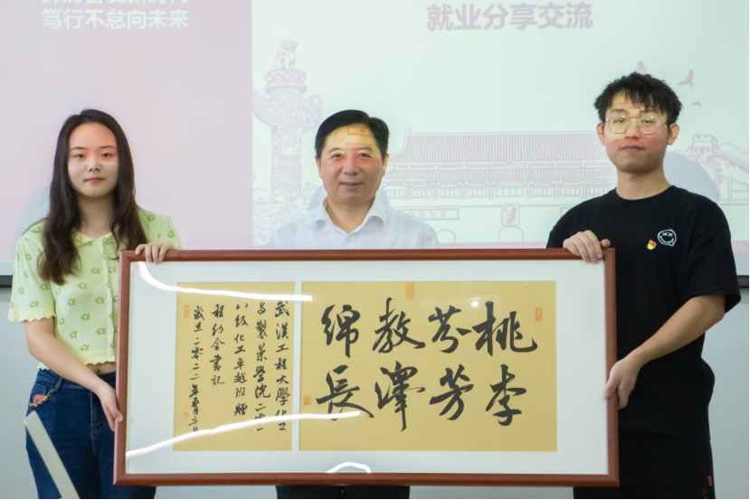 作为“回赠”,王子翔、袁丽婷则代表全班同学赠送了为程书记集体准备的礼物——一幅书法作品《桃李芬芳 教泽绵长》。