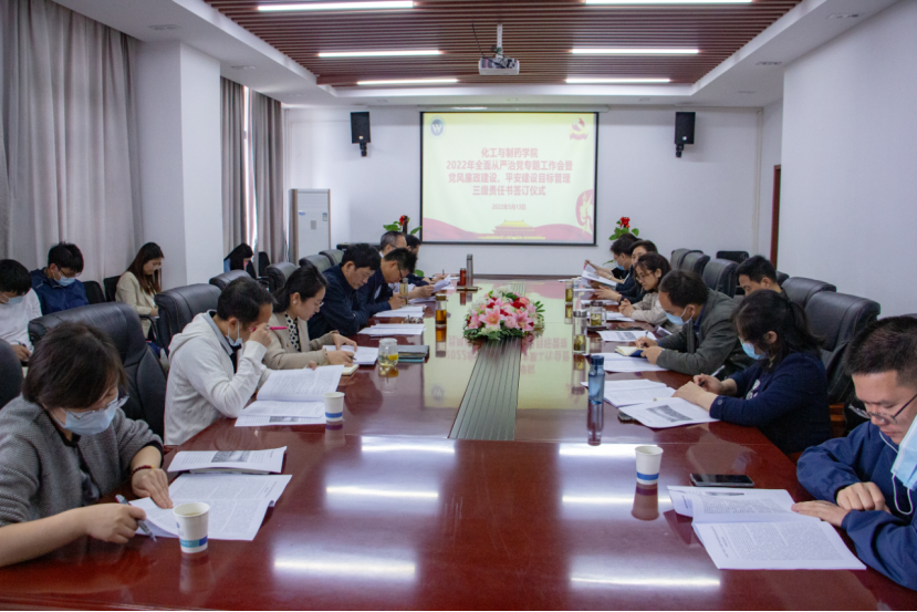 在化工大楼605会议室举行了2022年全面从严治党专题工作会暨全面从严治党、党风廉政建设、平安校园建设目标管理三级责任书签订仪式,学院党委书记汪铁林主持会议。