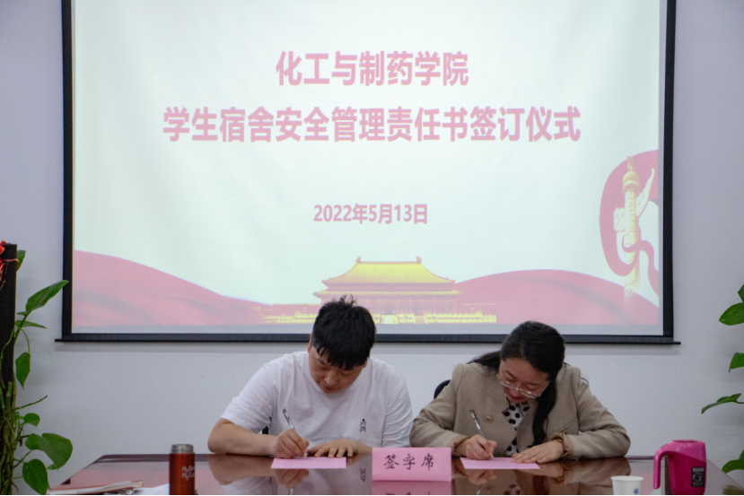副书记周丹与辅导员代表梅军签订学生宿舍安全管理责任书。