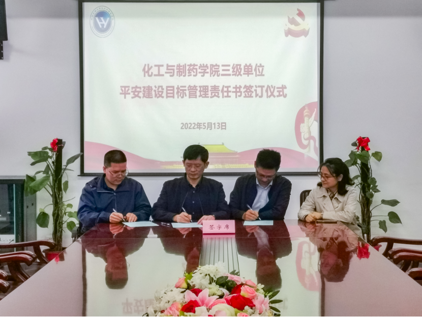 汪铁林、易群与三级单位代表化工原理党支部书记李萍、中心主任覃远航签订三级单位平安建设目标管理责任书。