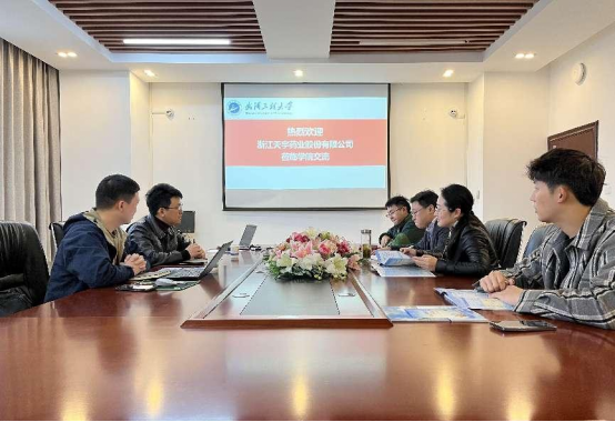 生炜光介绍了天宇药业的发展前景和与企业发展同步的人才需求情况,虞跃从研发平台、资源与团队、制造平台和愿景四个方面做了详细介绍,校企双方就人才培养与深度合作进行了交流和探讨。