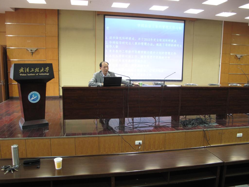 随后,王凯副院长就本科工程认证和审核评估教学文件整改等相关工作进行了说明,并作相应要求;刘生鹏副院长通报了学院2016年研究生复试的情况;郭嘉副院长着重对实验室消防安全工作进行了的布置,并详细解读了化工大楼科研用房管理办法。田琦峰副院长宣讲了科研经费管理办法。