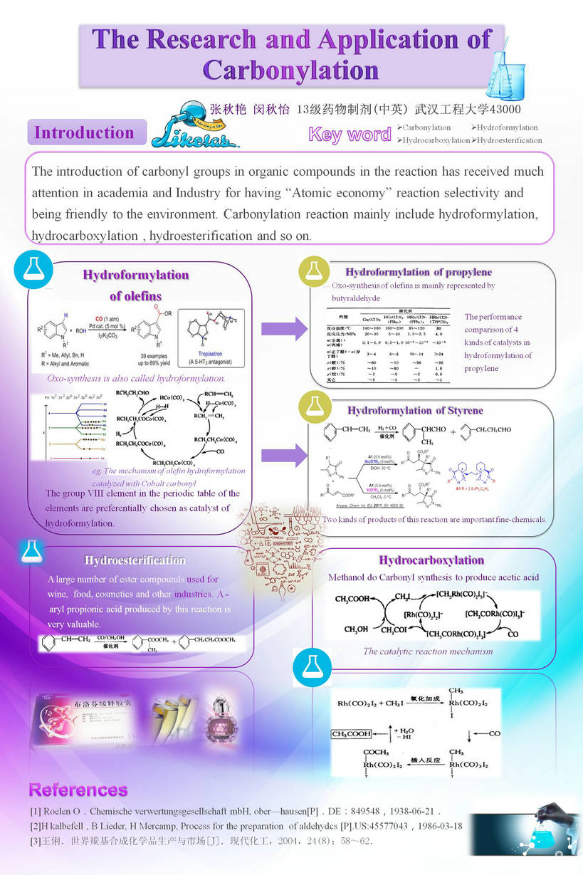 本次竞赛共收到学生参赛作品120份,经竞赛委员会组织评选,国际学院2013级药物制剂(中英)03班张秋艳和闵秋怡同学共同完成的作品“The Research and Application of Carbonlyation”获得壁报制作特等奖。
