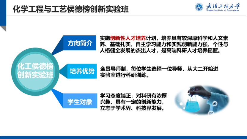立足化学工程与技术优势学科和化学工程与工艺国家级特色专业,于2009年开始组建化学工程与工艺侯德榜创新实验班(以下简称化工侯德榜班),实施创新性人才培养模式,积极探索并构建具有学校化工特色的高素质创新人才培养机制,培养和造就 “厚基础、宽口径、强能力、高素质”的本科优秀人才。