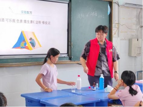 为了让大家深入了解健康饮水与安全玩水知识,“许愿计划”社会实践团成员协同“曜研”研究生实践团队设计了三个趣味实验:变色“可乐”、危险的色素、神奇乒乓。在欢快的氛围中,孩子们在实验互动中学习到了碘酒淀粉与维生素C的反应,可食用色素的标准以及浮力产生的原理。