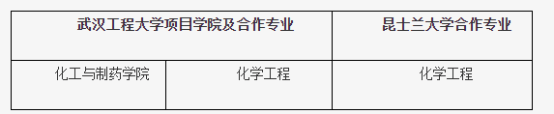 武汉工程大学与澳大利亚昆士兰大学(The University of Queensland)联合举办化学工程“1+1+1”双硕士项目。学生第一年在武汉工程大学学习,第二年到昆士兰大学学习,第三年回到武汉工程大学继续完成学业,在三年内获得两个硕士学位。通过“1+1+1”模式,学生可更加深入了解多元社会文化,参加昆士兰大学研究生课程,增强跨文化交流能力,最终获得两个硕士学位,增强国际职业竞争力。