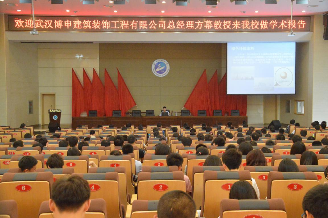 5月6日上午,武汉博申建筑装饰工程有限公司总经理方幕在流芳校区四教多功能报告厅作了题为“绿色环保涂料——创新与创业漫谈”的学术报告。足彩比分 、国际学院300余名学生聆听了报告,报告会由“有关人才计划”特聘教授、科技处处长郭嘉主持。