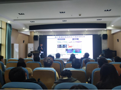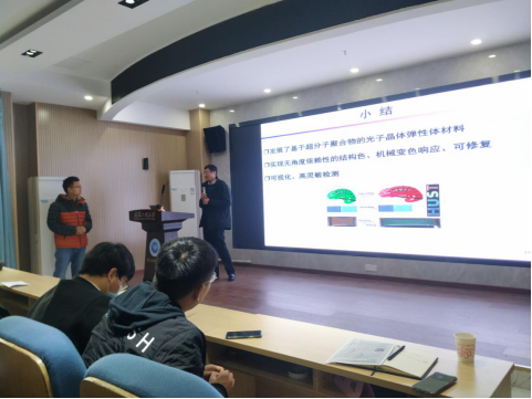 报告开始,张连斌教授从介绍光子晶体应用于涂料、防伪涂层等各个领域引出主题,并从以下三个部分来讲解:第一部分为结构色与光子晶体,通过有序结构实现特定波长光波反射,来达到无污染、低耗能和不褪色的优势;第二部分为基于超分子聚合物的光子晶体,通过聚合物与光子晶体的有机结合,并采用局部/短程有序、整体/长程无序来使晶体材料无角度依赖性,采用大形变的复合材料增宽变色范围,利用聚合物基体的可逆相互作用可修复损伤;第三部分为检测和图案化应用,为增宽检出范围和提高颜色对比度,采用对不同区域分别修饰的方法,即使用两种对同一刺激具有相反响应性的单体来设计光子晶体隐形图案。