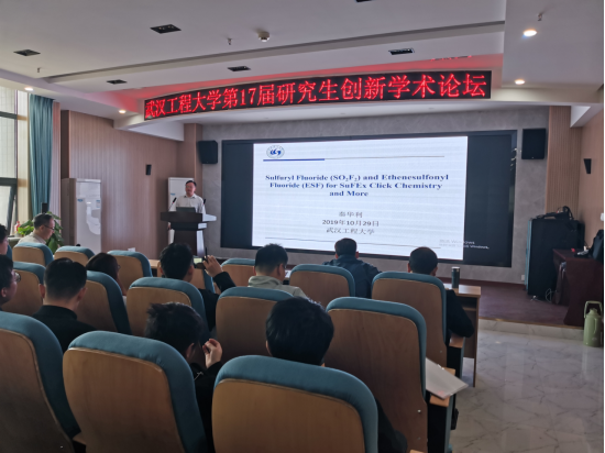 师生做了题为“Sulfuryl Fluoride (SO2F2) and Ethenesulfonyl Fluoride (ESF) for (SuFEx) Click Chemistry and More”的学术报告。报告会由副院长龙思会教授主持,学院师生共计100余人聆听了报告。此次报告会是学院“研究生创新学术论坛”系列活动之一。