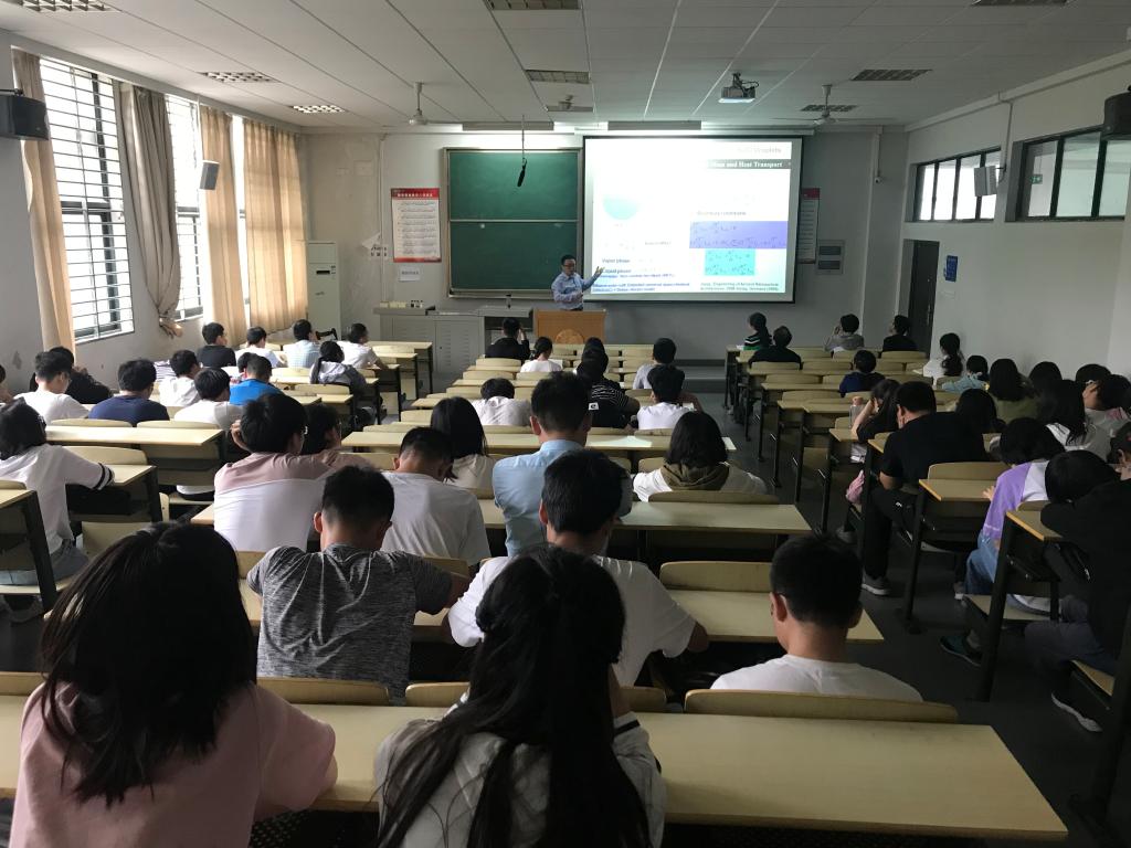 报告开始,姜兴茂教授以生动幽默的语言风格、深入浅出地向同学们介绍了化学工程知识在纳米结构材料的应用。姜教授以“怎么烤红薯又香又好吃”的提问开场,立刻唤起了同学们的兴趣。随后他分别从气溶胶蒸发自组装、多组分液滴蒸发过程、纳米结构材料可控制备、纳米结构材料应用四个方面进行了讲解。姜教授现场向同学们展示了各种纳米氧化银、纳米氧化锌、纳米氧化铜等样品,展示了融入了高科技生产技术的纳米抗菌袜子,并于会后免费赠送给在场同学。