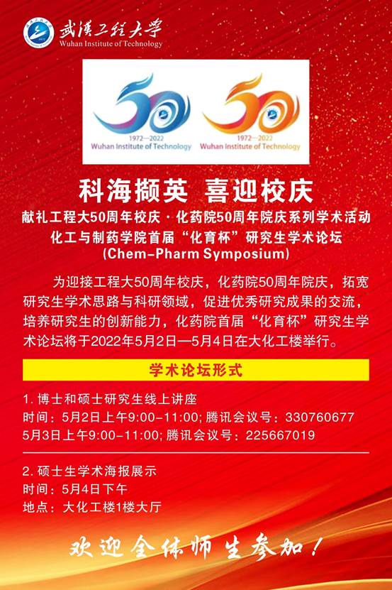为迎接工程大50周年校庆,化药院50周年院庆,拓宽研究生学术思路与科研领域,促进优秀研究成果的交流,培养研究生的创新能力,化药院首届“科海撷英,喜迎校庆”化育杯研究生学术论坛将于2022年5月2日-5月4日在大化工楼举行。