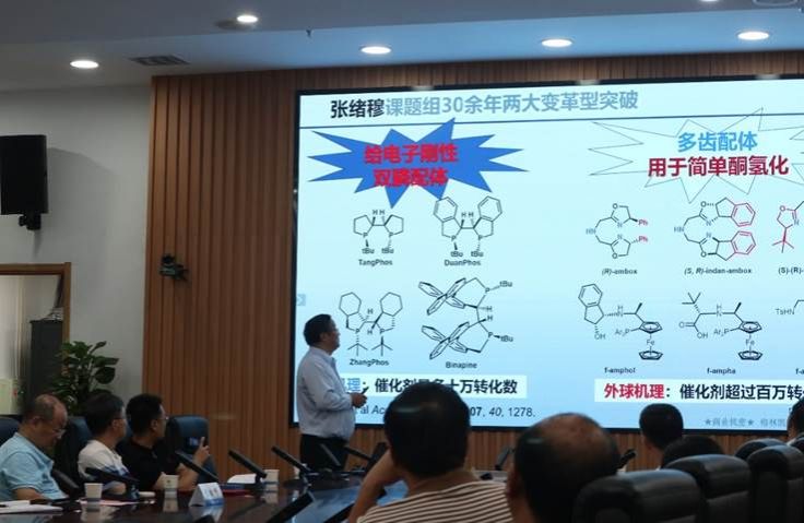 张绪穆教授作了题为“绿色催化-决胜制药”的学术报告。他从绿色合成的关键技术——催化不对称氢化出发,分享了其团队30余年在双膦配体和多齿配体等领域的开创性研究和产业化应用。详细介绍了其团队发现的新催化剂、新反应、新方法和开发的药物合成新工艺,充分诠释了手性药物合成中绿色催化在降低生产成本、减少环境污染、提高产品质量和保障安全可控等方面的巨大优势。该团队开发的多项颠覆性制药新工艺,具有重大的经济价值、环保价值和社会意义,体现了绿色催化的极大魅力。足彩比分 院长易群主持报告会。